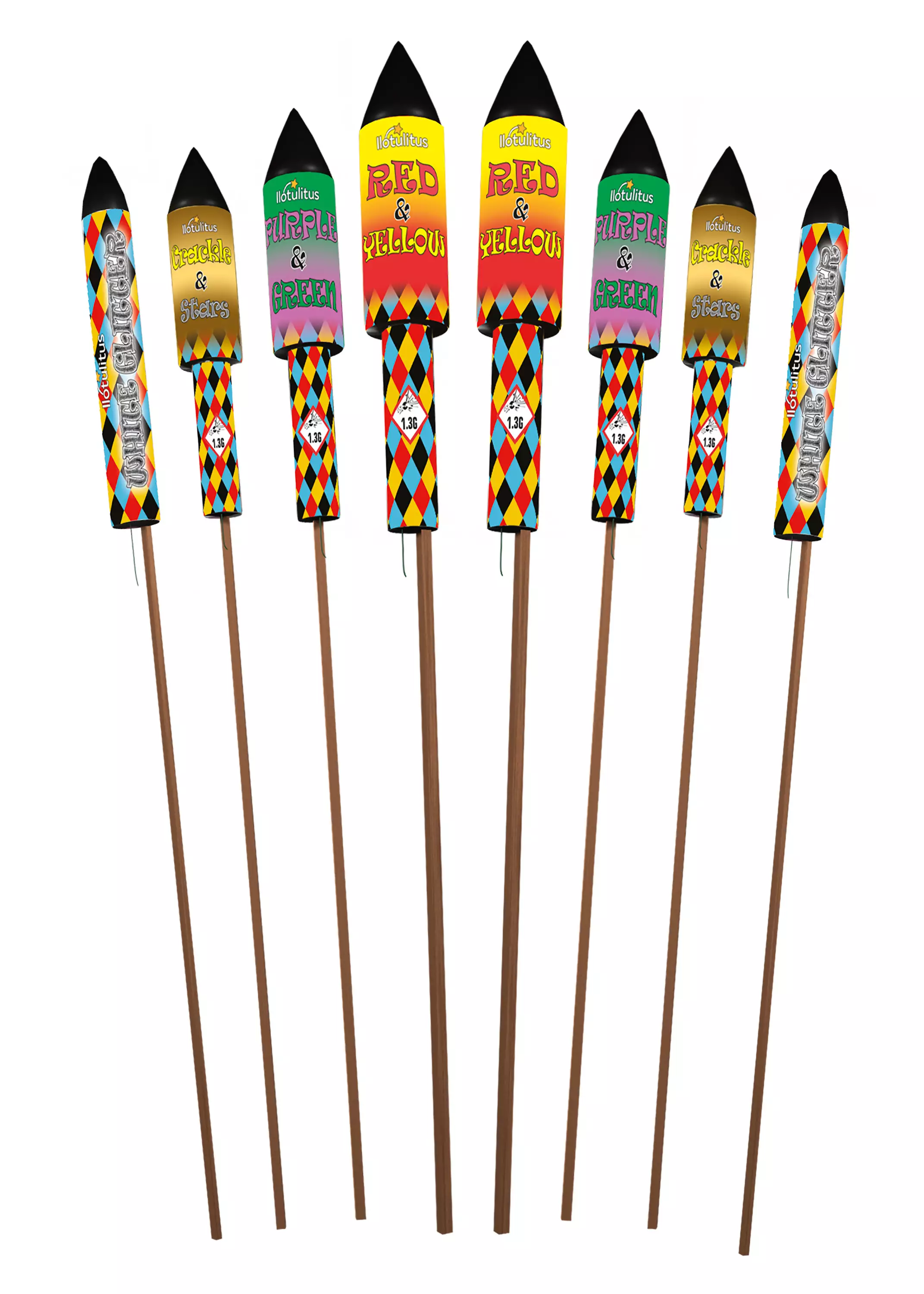 Jokeri on kahdeksan raketin pakkaus, jossa on parhaat 1.3G-teholuokan raketit – ilman mitään pikkunapsuja. Kun haluat rehellisen rakettisetin, joka keskittyy kunnon nousuun ja efekteihin, Jokeri on varma valinta.