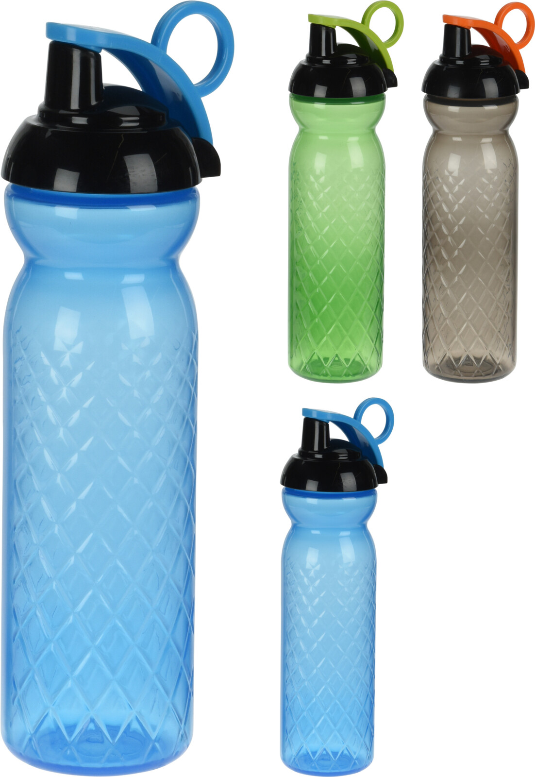 680 ml urheilujuomapullo, läpinäkyvä, kolme väriä, kiinnitysklipsi.