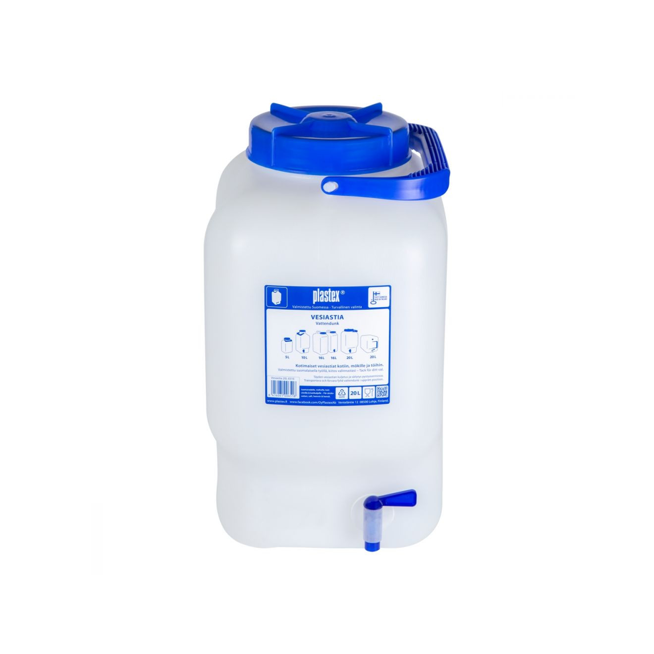 Laadukas kotimainen elintarvikekelpoisesta muovista valmistettu hanallinen vesiastia. Helppo kuljettaa kantokahvan avulla, sopii veden lisäksi hyvin myös mm. mehulle, kotiviinille ja kotikaljalle. Tästä riittää juotavaa jaettavaksi koko joukkuelle! Tilavuus 20 litraa.